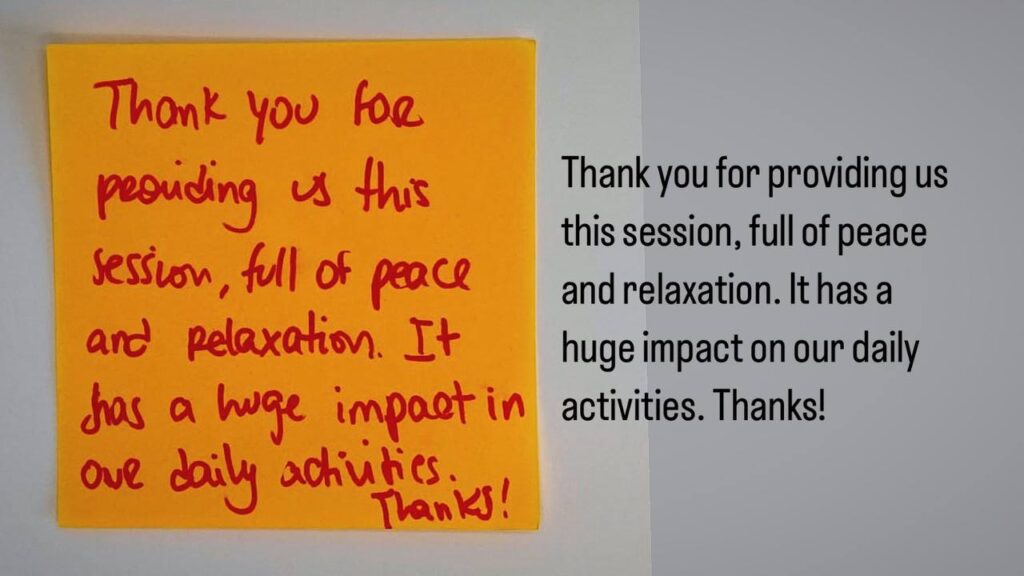 Each week, you help choose the meditation theme through WhatsApp group polls. Whether it’s managing stress, reconnecting with your inner child, or boosting concentration, you’ll have a unique experience. The sessions include:”